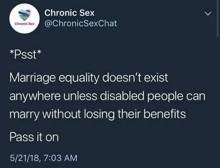If I married him, the government would literally expect me to care for him and be his sole source of income. He would lose all of his benefits, including SSDI. Spouses are expected to share income and that effects ALL of his benefits, even his health insurance. We simply can’t afford to be married.