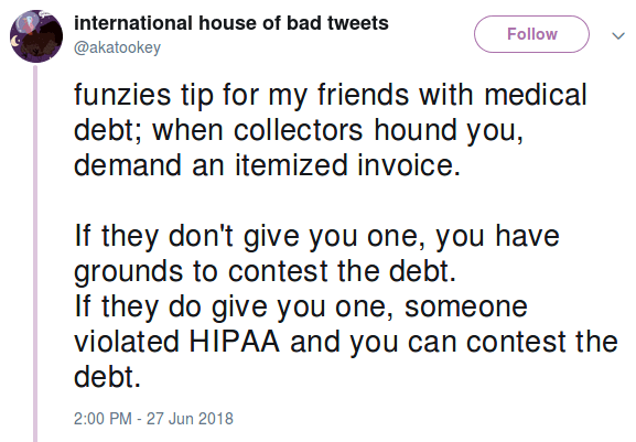 [Image: A tweet from @akatookey, which reads: “funzies tip for my friends with medical debt; when collectors hound you, demand an itemized invoice.