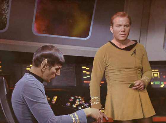 Anyway, Kirk wearing the “female uniform”