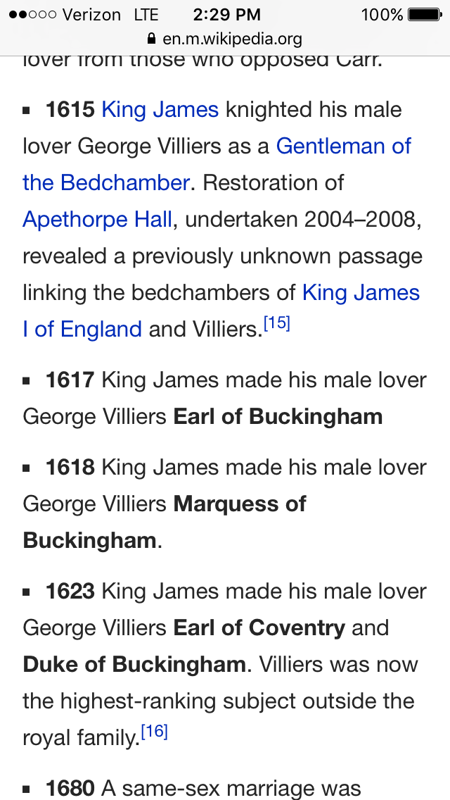 fun thing about king James, this guy was fairly public about his bf (more public than what was acceptable). He threw lots of extravagant parties with his man on his arm. It pissed off the church obviously so to get them off his back, he’s the one that ordered the third translation of the Bible from Hebrew to English (the King James Version aka the Authorized Version) so the Bible every hot blooded all American Christian reads today was literally just written so a very gay king could fuck his boyfriend in peace.