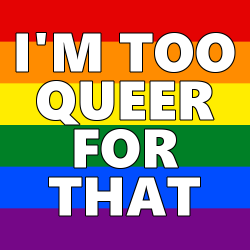 chaosbitches Uncategorized August 10, 2018December 6, 2018 1 Minute queerlection: [Image description – Image of the rainbow pride flag with the text: I’m too queer for that. End description.] Share this: Share on X (Opens in new window) X Share on Facebook (Opens in new window) Facebook Like Loading... Related Published by chaosbitches View all posts by chaosbitches Published August 10, 2018December 6, 2018
