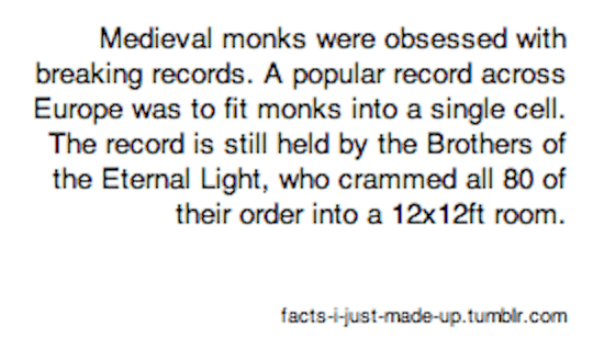 And so, until all 80 monks could fit into the washroom, the abbot ordered brother after brother to take the “Sacred Second Baptism Of Final Equilibrium.” In liquid form, the brothers fit easily into the washroom basin and the order reclaimed its record. The abbot was then arrested for murder and lived out his days in an 8×6 cell, 2ft larger than his cell at the monastery, into which he claimed he could fit 98 monks, given a proper crematorium and distillery.