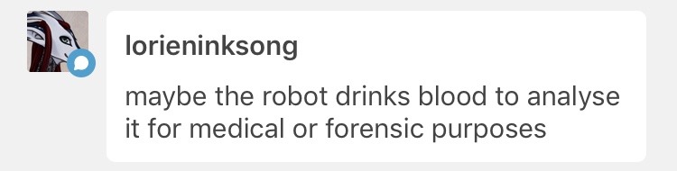 Dr. 2: “he’s just taking a blood sample. he’s got testing equipment inside of him where a stomach should be. measures all sorts of useful things.”