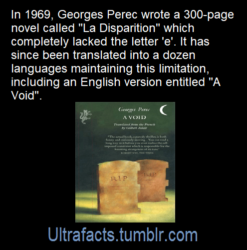 Perec followed up La Disparition by writing Les Revenentes, which contains no vowels except E.