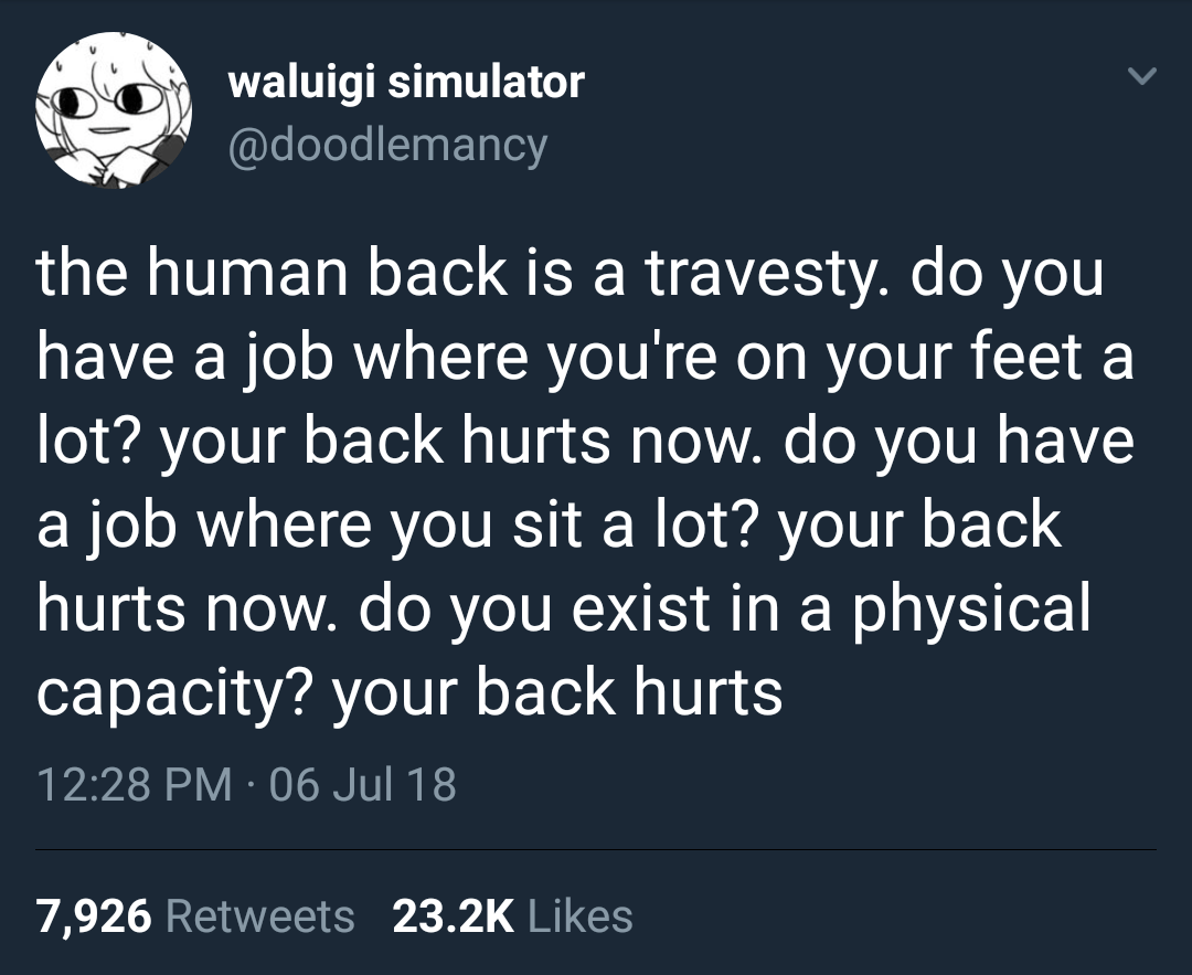 i once heard a scientist in a documentary about evolution refer to the human spine as an “architectural nightmare” and then procede to explain why every back is a bad back. it was so validating.