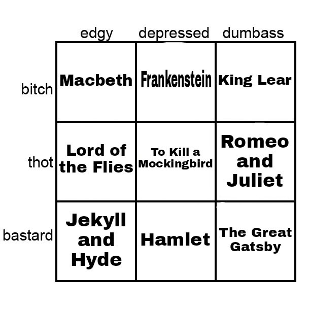 chaosbitches Uncategorized September 22, 2018December 6, 2018 1 Minute theevilsnuffleupagus: alignment chart based on which piece of high school english class literature you actually enjoyed Share this: Share on X (Opens in new window) X Share on Facebook (Opens in new window) Facebook Like Loading... Related Published by chaosbitches View all posts by chaosbitches Published September 22, 2018December 6, 2018