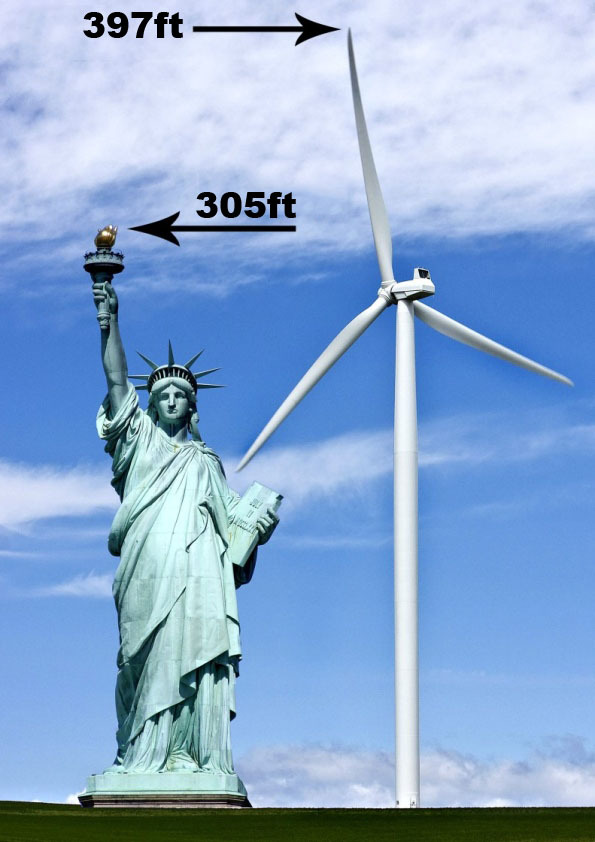 The initial image is a size comparison between the statue of liberty and a wind turbine. The wind turbine is over ninety feet (about 28 meters) taller.