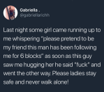 This has happened to me before when I was in college at a frat party. This girl comes squeezing herself in between me and my friend and throws her arms around me. “Amanda, I am so glad you decided to come!” I was so confused and just figured she was drunk and mistaked me for someone else, until I saw the panic on her face. She leaned close and whispered that a guy was following her, was certain that he had put something in her drink and if I would please play along. I looked behind her and sure enough, some creep was watching her like a hawk. We invited her to hang out with us the rest of the night and even waited until her ride showed up just to make sure she was safe. Always look out for each other!