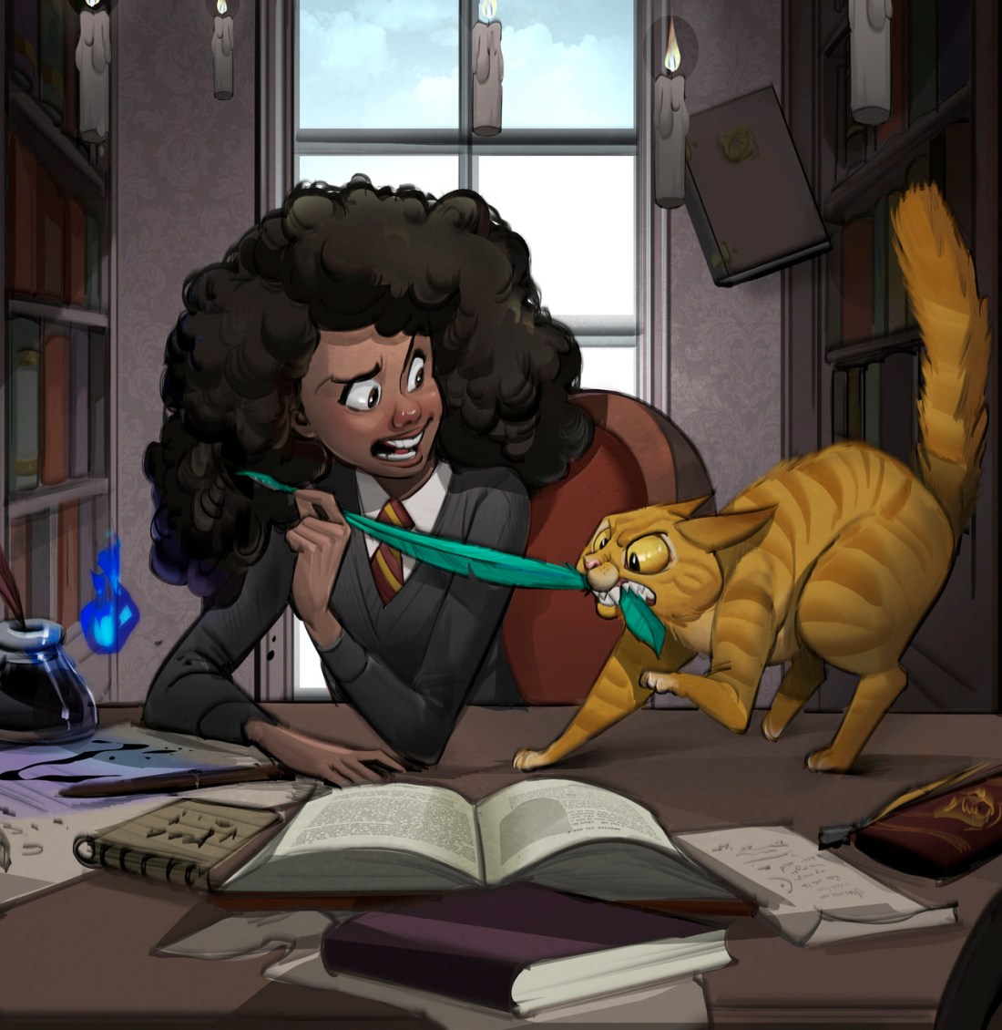I think the least believable part of the Harry Potter novels is the idea that all these feathery quills and pet cats are getting along in perfect harmony. Let me tell you, J.K. Rowling, not a thing would get done at Hogwarts!