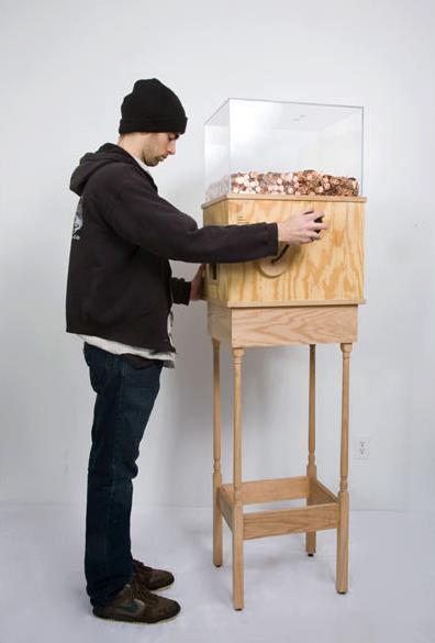 This machine allows anyone to work for minimum wage for as long as they like. Turning the crank on the side releases one penny every 4.97 seconds, for a total of $7.25 per hour. This corresponds to minimum wage for a person in New York. This piece is brilliant on multiple levels, particularly as social commentary. Without a doubt, most people who started operating the machine for fun would quickly grow disheartened and stop when realizing just how little they’re earning by turning this mindless crank. A person would then conceivably realize that this is what nearly two million people in the United States do every day…at much harder jobs than turning a crank. This turns the piece into a simple, yet effective argument for raising the minimum wage.