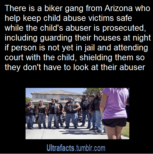 Chief’s thesis was that a child who has been abused by an adult can benefit psychologically from the presence of even more intimidating adults that they know are on their side. “When we tell a child they don’t have to be afraid, they believe us,” Arizona biker Pipes told azcentral.com. “When we tell them we will be there for them, they believe us.” ( Article)