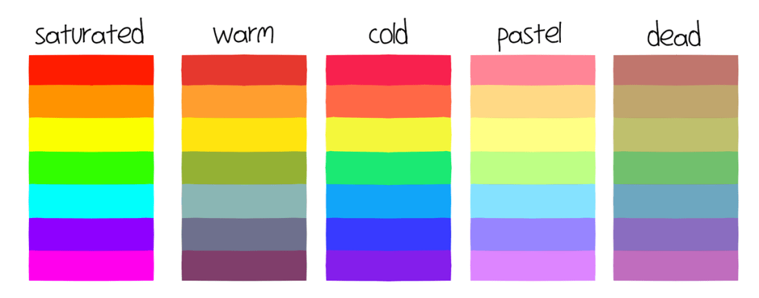 not sure if this is actually helpful to anyone but I feel like the use of colors is very important for the kind of feeling you’re going for with your art! so I thought I’d show you what I think when I say “warm/cold/etc. colors”. keeping yourself inside one of the categories when drawing a piece can be very helpful – of course you don’t have to use only the colors showed here, mixing stuff is rad. But just to get the concept yknow